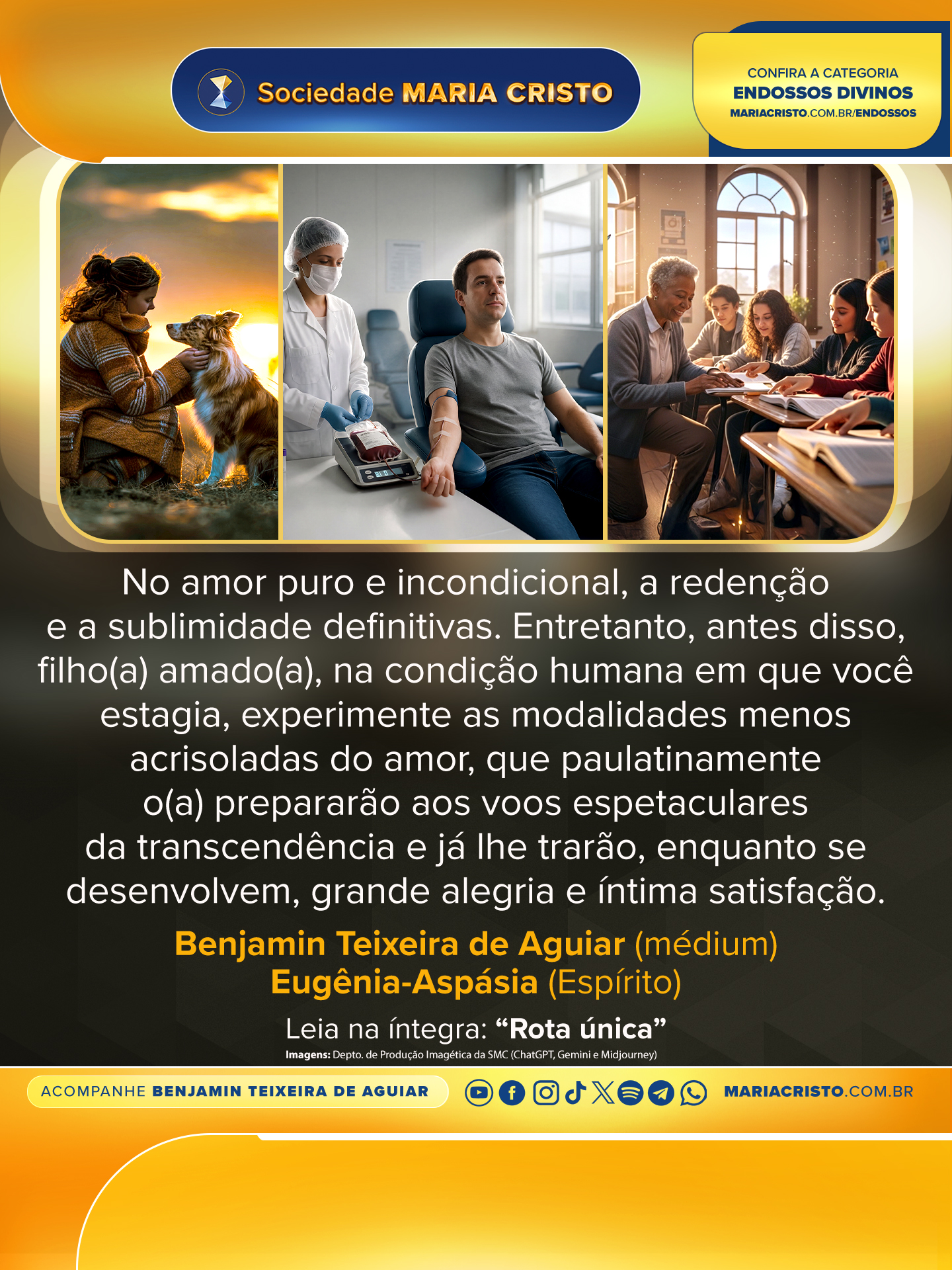 Entretanto, antes disso, filho(a) amado(a), na condição humana em que você estagia, experimente as modalidades menos acrisoladas do amor, que paulatinamente o(a) prepararão aos voos espetaculares da transcendência e já lhe trarão, enquanto se desenvolvem, grande alegria e íntima satisfação.