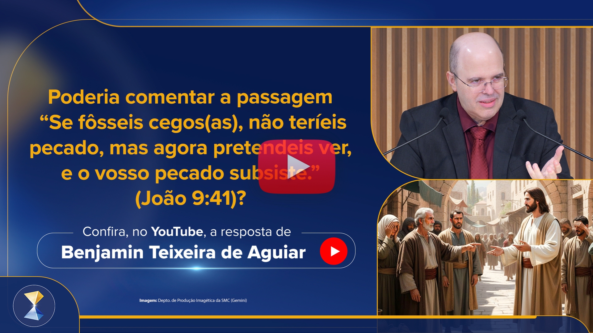 “Se fôsseis cegos(as), não teríeis pecado, mas agora pretendeis ver, e o vosso pecado subsiste.” (João 9:41)27 de janeiro de 2026 | Benjamin Teixeira de Aguiar responde, Vídeos breves com temas diversos Destaque da palestra realizada em 18/01/26