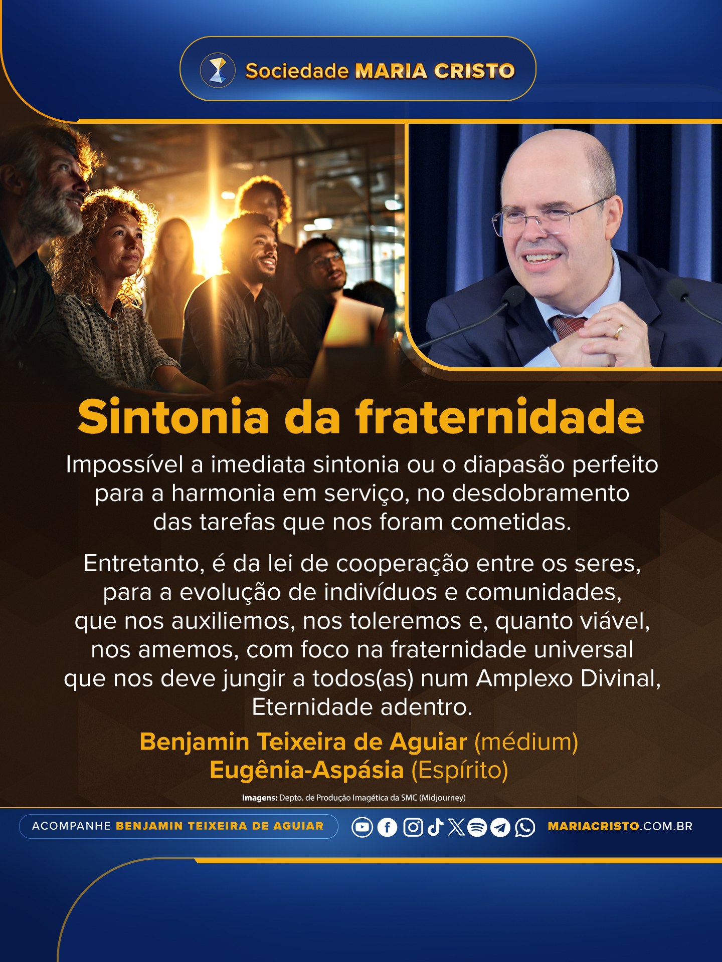 Entretanto, é da lei de cooperação entre os seres, para a evolução de indivíduos e comunidades, que nos auxiliemos, nos toleremos e, quanto viável, nos amemos, com foco na fraternidade universal que nos deve jungir a todos(as) num Amplexo Divinal, Eternidade adentro.