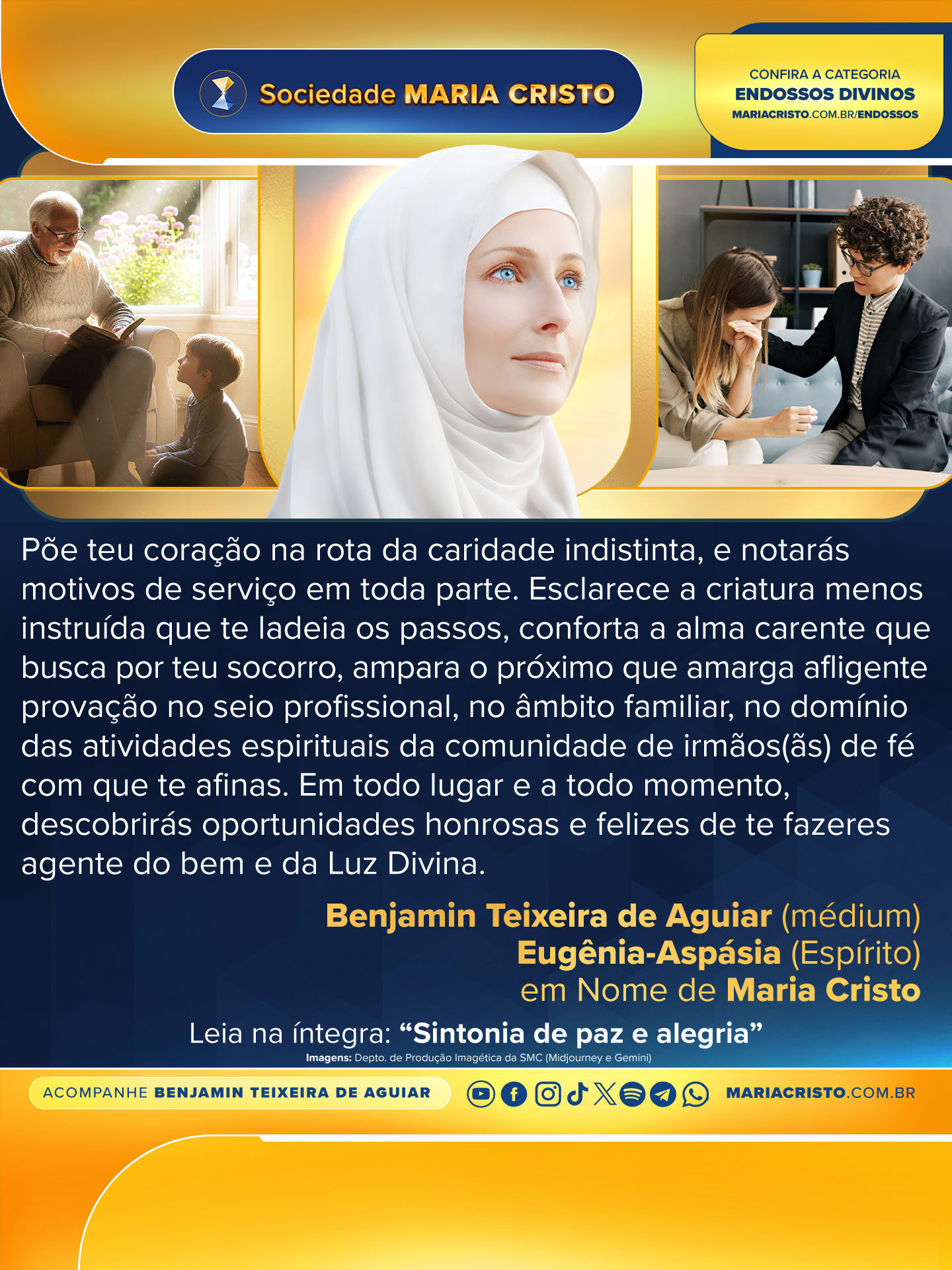 Esclarece a criatura menos instruída que te ladeia os passos, conforta a alma carente que busca por teu socorro, ampara o próximo que amarga afligente provação no seio profissional, no âmbito familiar, no domínio das atividades espirituais da comunidade de irmãos(ãs) de fé com que te afinas.