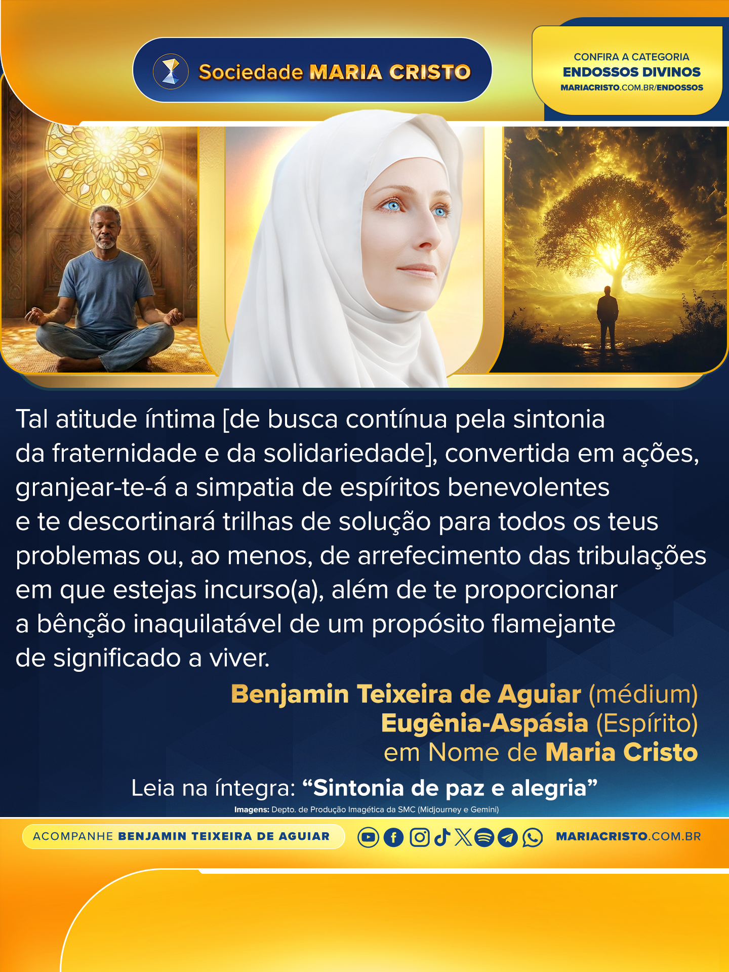 Tal atitude íntima, convertida em ações, granjear-te-á a simpatia de espíritos benevolentes e te descortinará trilhas de solução para todos os teus problemas ou, ao menos, de arrefecimento das tribulações em que estejas incurso(a), além de te proporcionar a bênção inaquilatável de um propósito flamejante de significado a viver.