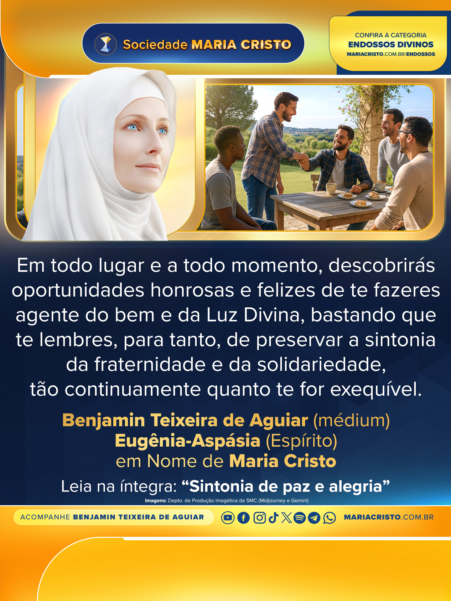 Em todo lugar e a todo momento, descobrirás oportunidades honrosas e felizes de te fazeres agente do bem e da Luz Divina, bastando que te lembres, para tanto, de preservar a sintonia da fraternidade e da solidariedade, tão continuamente quanto te for exequível.