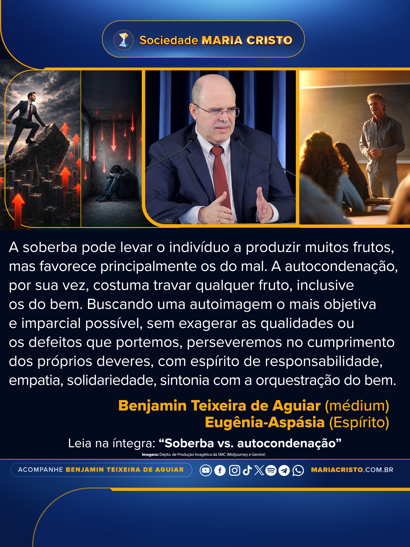 Buscando uma autoimagem o mais objetiva e imparcial possível, sem exagerar as qualidades ou os defeitos que portemos, perseveremos no cumprimento dos próprios deveres, com espírito de responsabilidade, empatia, solidariedade, sintonia com a orquestração do bem.