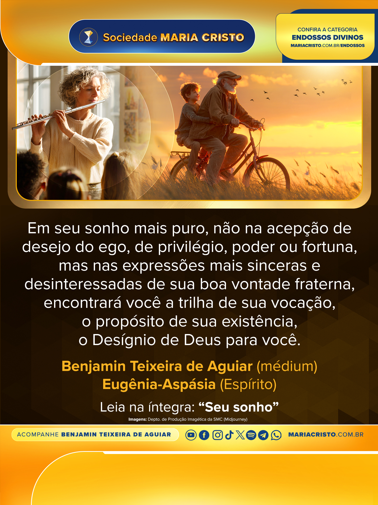 Em seu sonho mais puro, não na acepção de desejo do ego, de privilégio, poder ou fortuna, mas nas expressões mais sinceras e desinteressadas de sua boa vontade fraterna, encontrará você a trilha de sua vocação, o propósito de sua existência, o Desígnio de Deus para você.