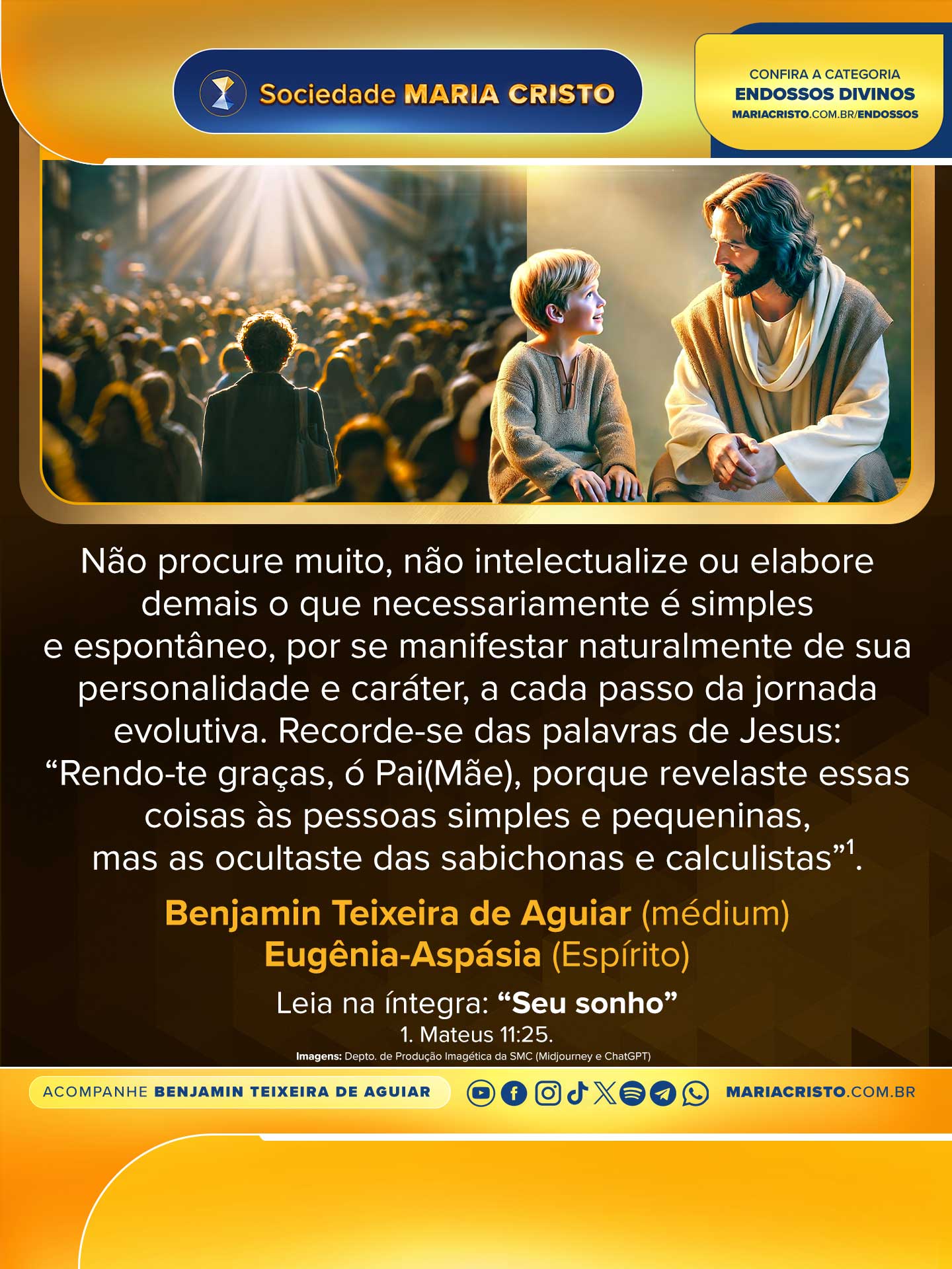 Recorde-se das palavras de Jesus: “Rendo-te graças, ó Pai(Mãe), porque revelaste essas coisas às pessoas simples e pequeninas, mas as ocultaste das sabichonas e calculistas”¹.