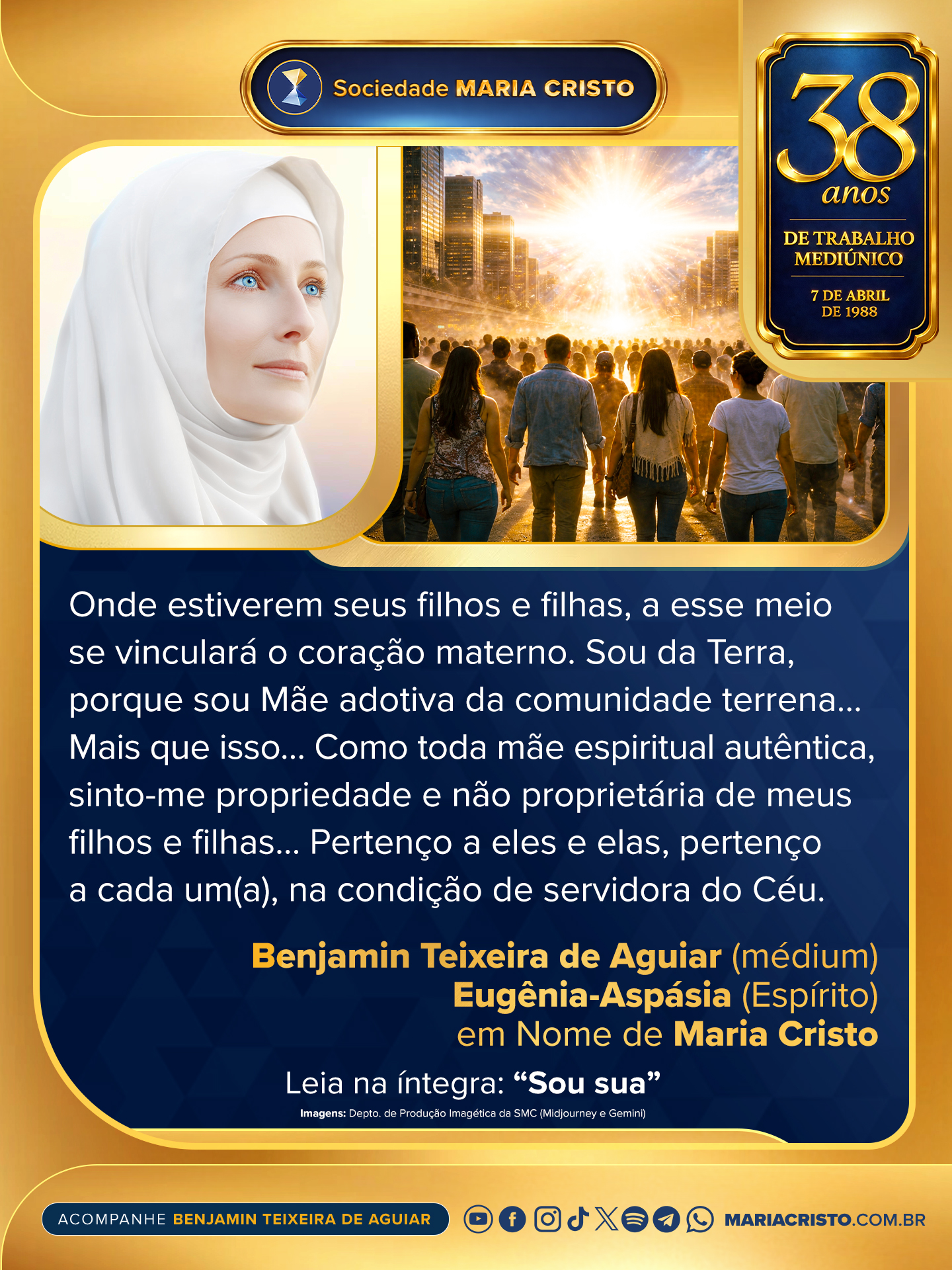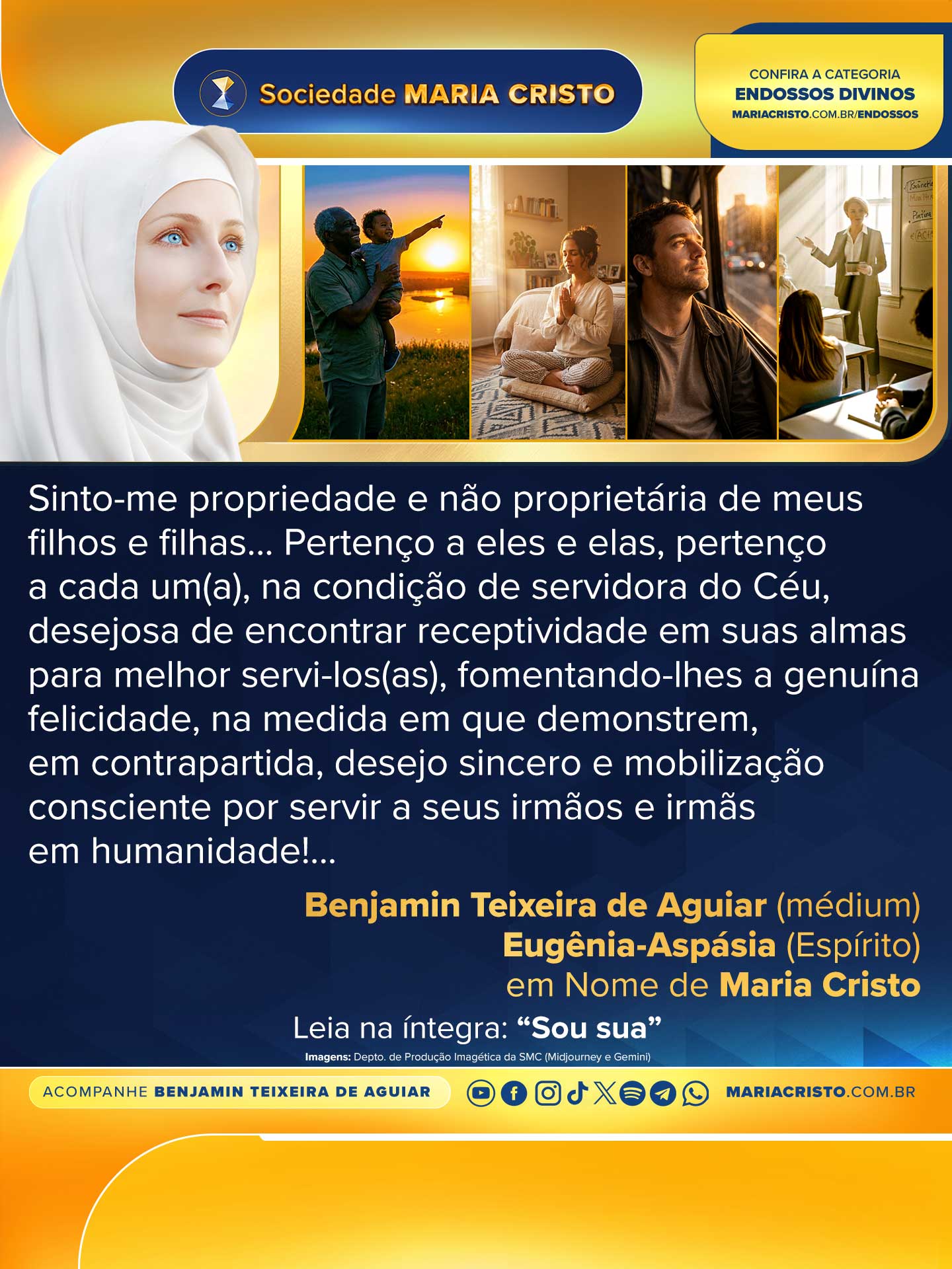 Pertenço a eles e elas, pertenço a cada um(a), na condição de servidora do Céu, desejosa de encontrar receptividade em suas almas para melhor servi-los(as), fomentando-lhes a genuína felicidade, na medida em que demonstrem, em contrapartida, desejo sincero e mobilização consciente por servir a seus irmãos e irmãs em humanidade!…