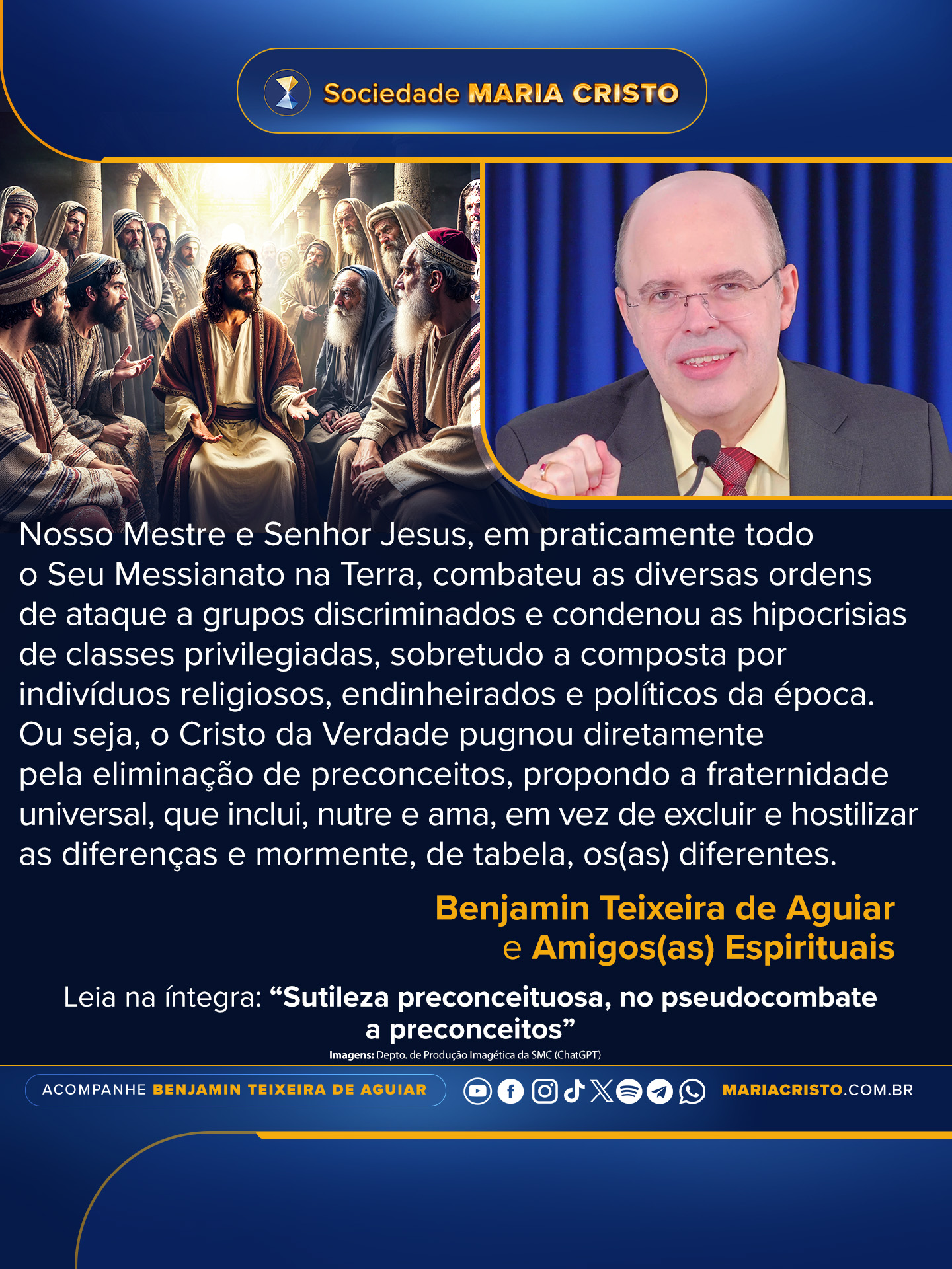 Nosso Mestre e Senhor Jesus, em praticamente todo o Seu Messianato na Terra, combateu as diversas ordens de ataque a grupos discriminados e condenou as hipocrisias de classes privilegiadas, sobretudo a composta por indivíduos religiosos, endinheirados e políticos da época. Ou seja, o Cristo da Verdade pugnou diretamente pela eliminação de preconceitos, propondo a fraternidade universal, que inclui, nutre e ama, em vez de excluir e hostilizar as diferenças e mormente, de tabela, os(as) diferentes.