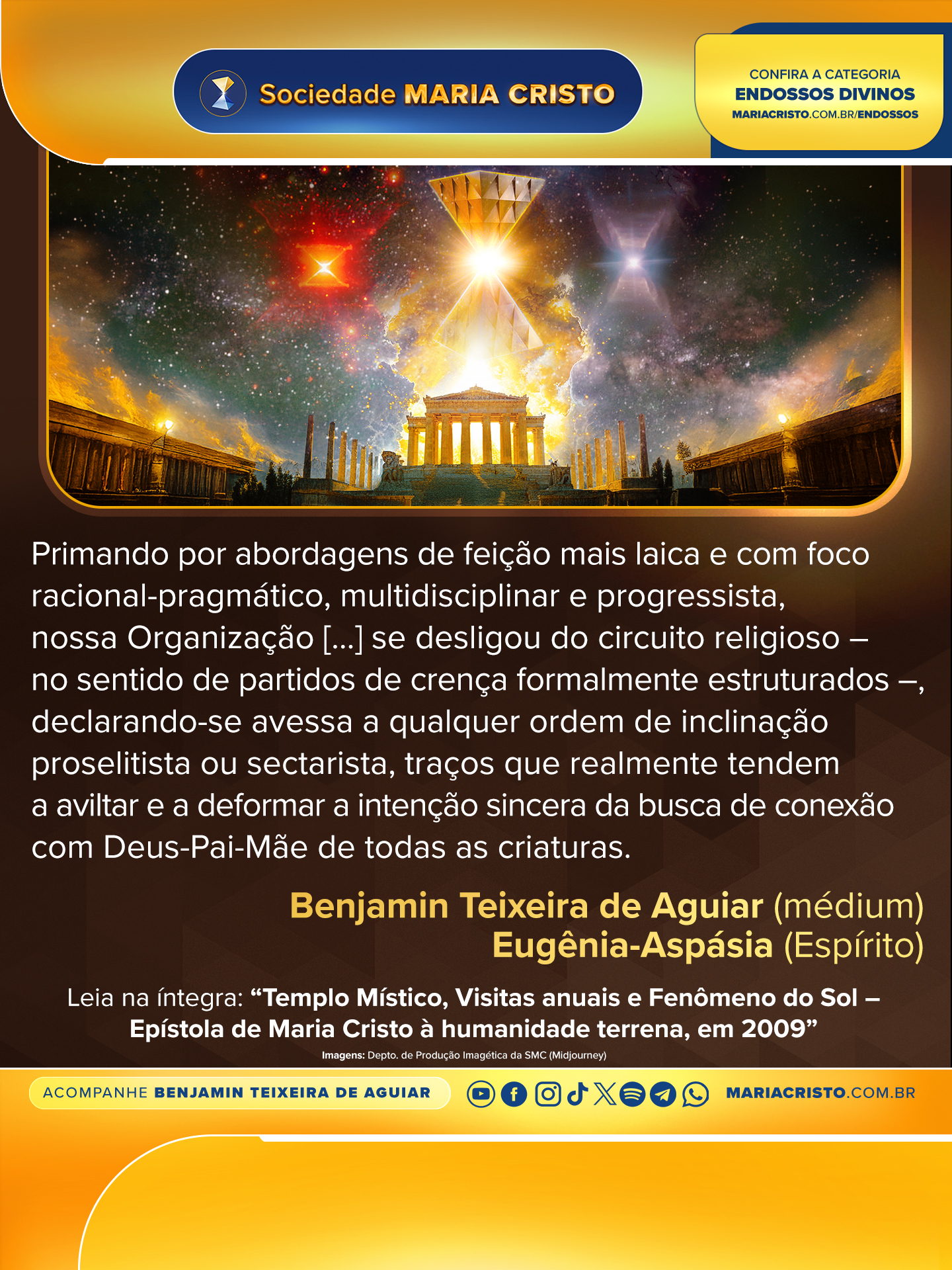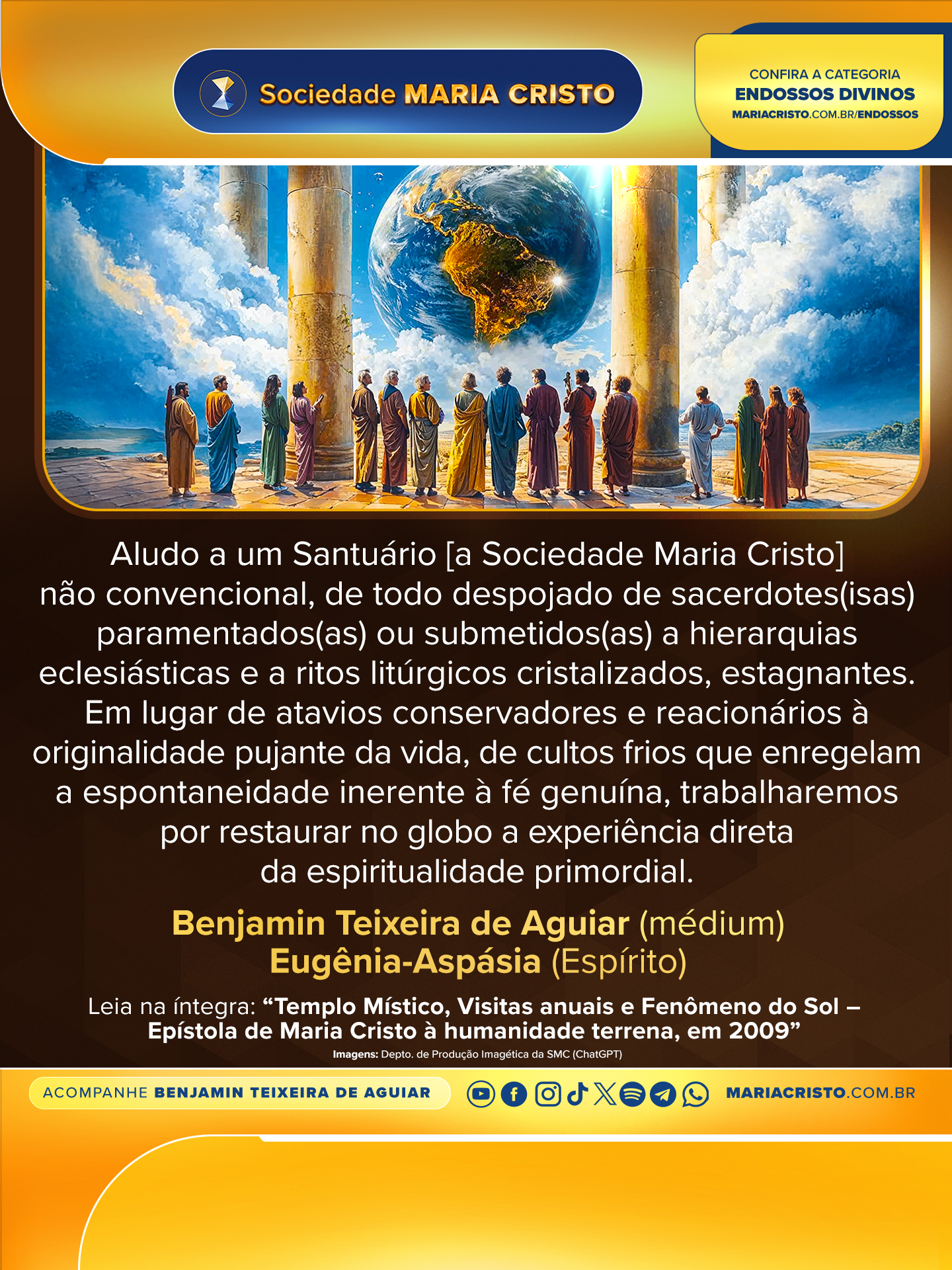 Prenhe de júbilo espiritual com a instituição desta Pedra-Angular que consiste na primeira Igreja Cristã de Maria Cristo sobre a Terra, em toda a história de dois mil anos de cristianismo, despeço-me, derramando sobre cada um(a) minhas emanações de ternura, proteção e paz,