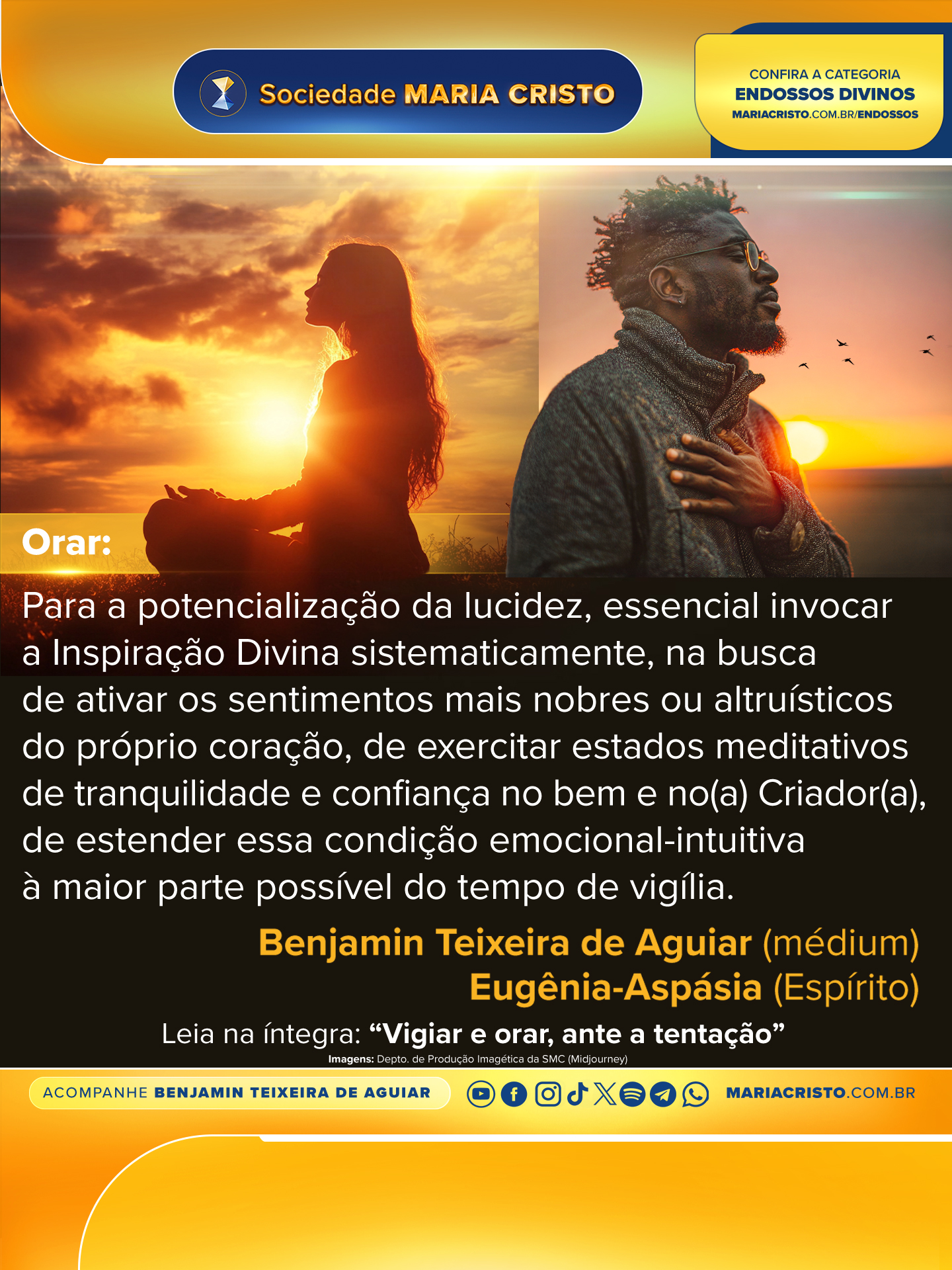 Para a potencialização da lucidez, essencial invocar a Inspiração Divina sistematicamente, na busca de ativar os sentimentos mais nobres ou altruísticos do próprio coração, de exercitar estados meditativos de tranquilidade e confiança no bem e no(a) Criador(a), de estender essa condição emocional-intuitiva à maior parte possível do tempo de vigília.