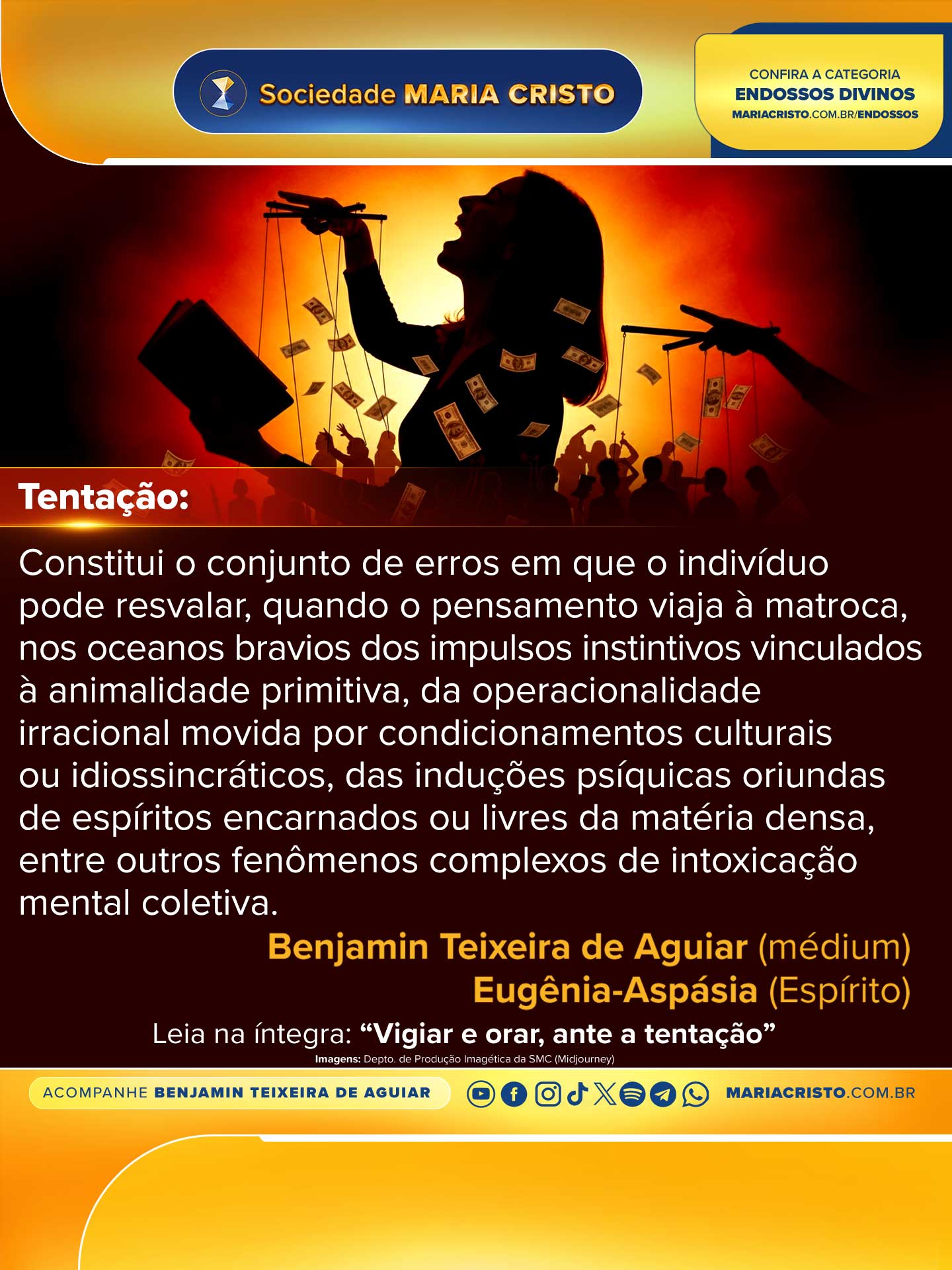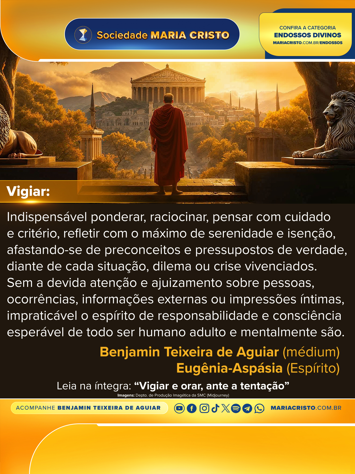 Com a célebre orientação “Vigiai e orai, para não cairdes em tentação”1, ínsita nos Evangelhos, Jesus concedeu à humanidade uma diretriz sólida de conduta com base em matrizes do pensar e do sentir, uma chave disciplinar propiciadora de escolhas de vida que resultem em mais amplos e numerosos acertos, uma válvula de segurança frenadora de equívocos e desvios de rota existencial, dos mais simples e sem consequências de vulto aos mais desastrosos e com efeitos de longa duração e expressivas proporções.
