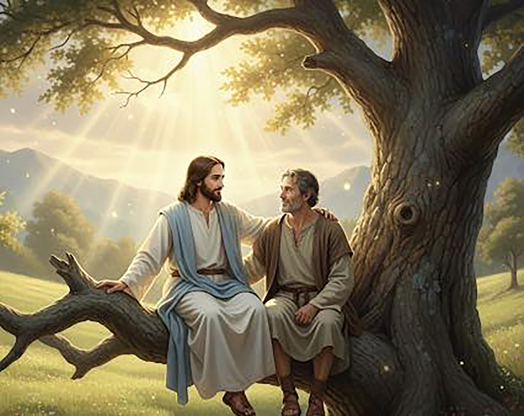 Sem qualquer laivo de “pompa e circunstância”, o Mestre dos mestres fez sinal para o intermediário entre os dois mundos, no sentido de que se sentasse ao Seu lado, sobre aquele grosso galho retorcido e rebaixado da árvore, que servia à guisa de banco. Envolvendo-lhe o ombro paternalmente, com o braço direito, enquanto, com desvelos de carinho, recostava Sua cabeça na do pupilo encarnado, fronte na fronte, declarou o Senhor, com naturalidade e entono afetuoso: